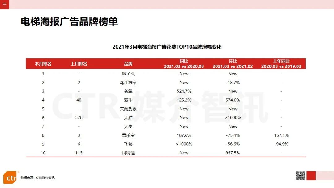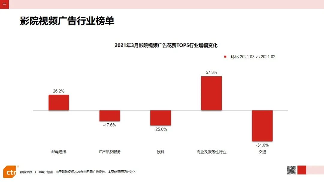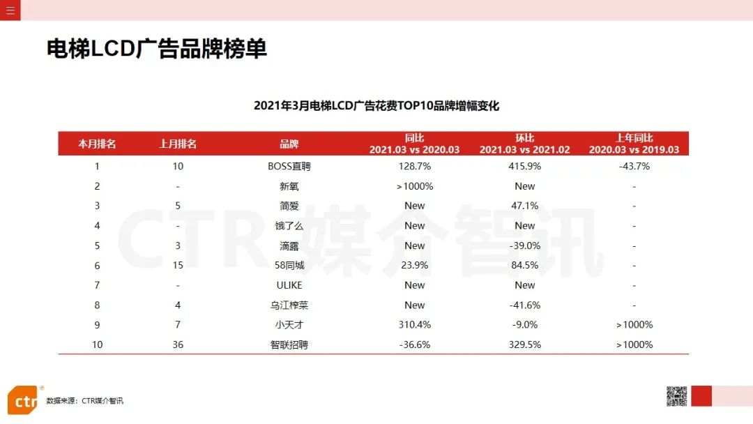 2021年3月多个行业的广告花费呈现增长,其中,邮电通讯、IT产品及服务、商业及服务性行业在多个广告渠道的广告花费均有所增长。从2月份开始,招聘App和网站的广告投放就有明显增长,3月份,智联招聘、BOSS直聘等招聘品牌在多个广告渠道特别是户外广告渠道的广告花费环比持续攀升。此外,一些生活服务类的互联网品牌,如贝壳找房、天鹅到家在传统户外、电梯广告、影院视频广告投放较多。