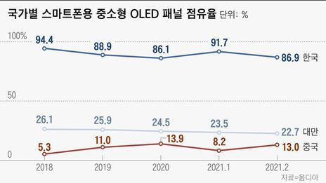 (从上到下)韩国、中国台湾、中国大陆企业在全球手机用中小型OLED市场的占有率 图表来源:朝鲜商业