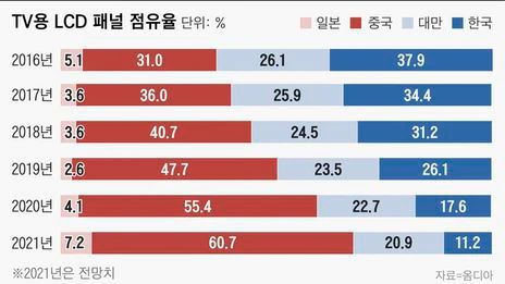 市场研究机构“omdia”的数据称,中国大陆企业今年在全球液晶电视面板市场的占有率有望达到60.7%,超过中国台湾(20.9%)、韩国(11.2%)、日本(7.2%)之和。