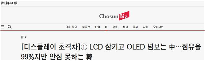 韩国业界一直对中国在液晶面板(LCD)上完成的反超难以释怀。4月28日,韩国第一大报纸《朝鲜日报》旗下媒体“朝鲜商业”(ChosunBiz)援引业内人士预测称,尽管韩国企业现在独霸了有机发光二极管(OLED)面板市场,但形势远没法让人安心,如果参考在LCD上发生的故事,中国厂商可能在5年内就在OLED领域超越韩国。