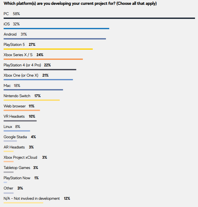 当被问到目前正在为哪一个平台开发游戏时,58%的人说了PC,32%的人说了iOS,31%说了安卓,27%说的是PS5,24%说的是XSX/S。