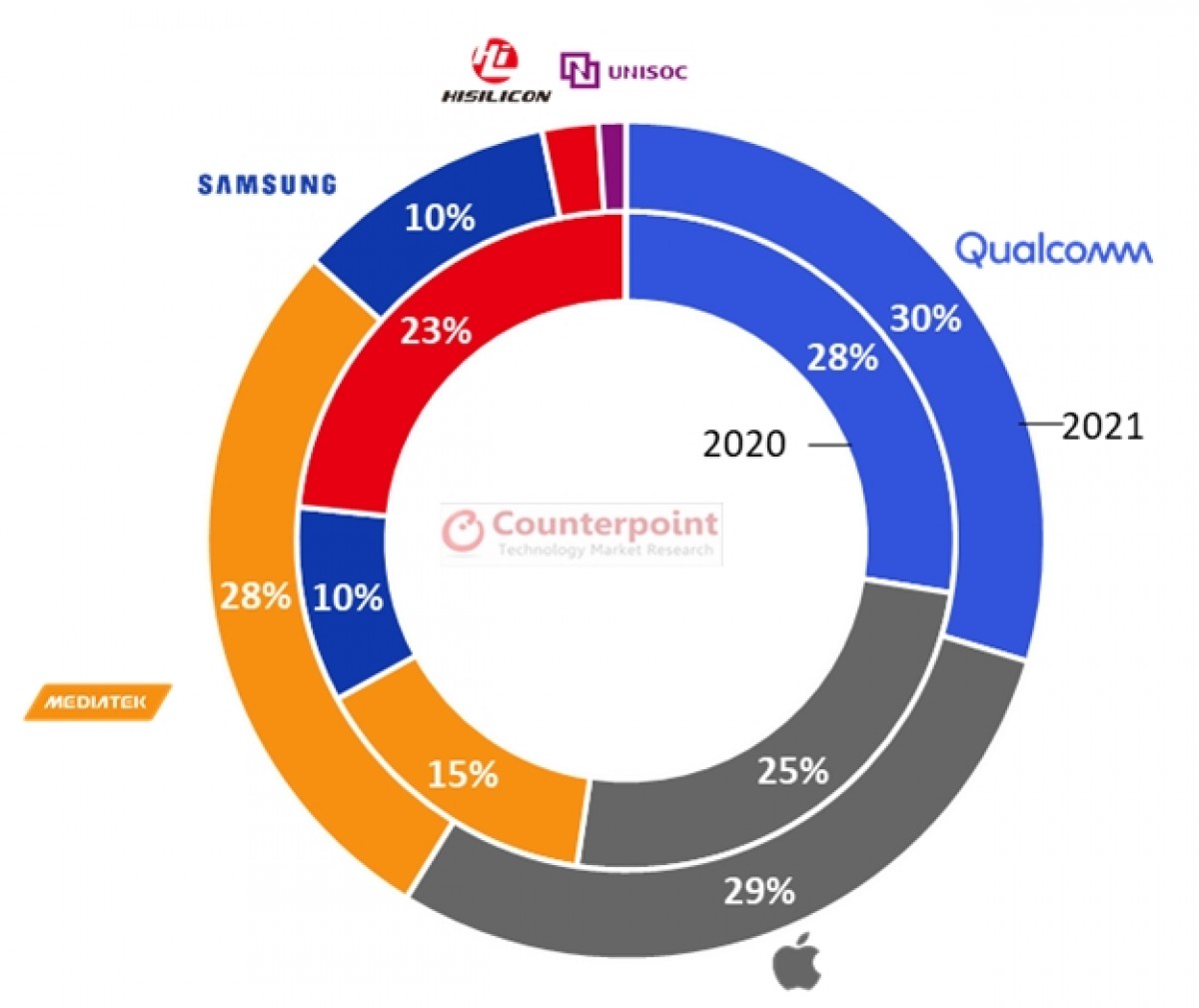 5G市场看起来略有不同,专用的5G芯片组正变得越来越普遍。一旦生产方面的瓶颈消除,高通公司将能在2021年下半年强劲反弹。然而,争夺头把交椅的战斗将变得比以往更加激烈,因为据预测,前三名玩家在市场份额方面相互之间的差异实际上已经很小。