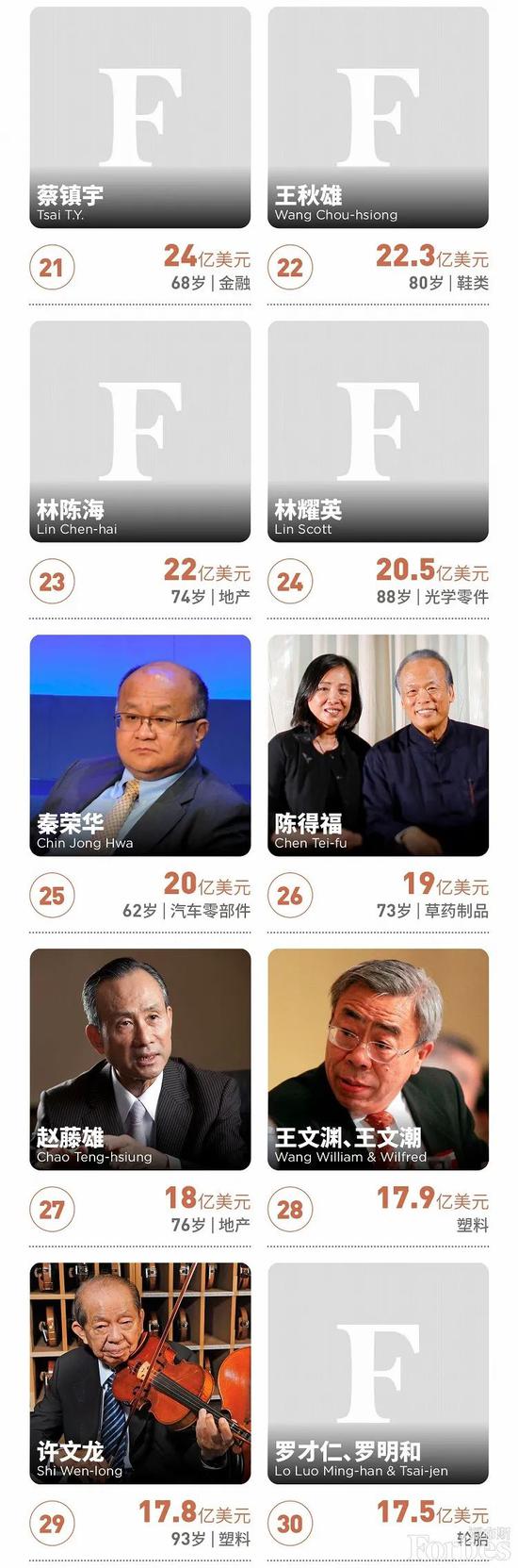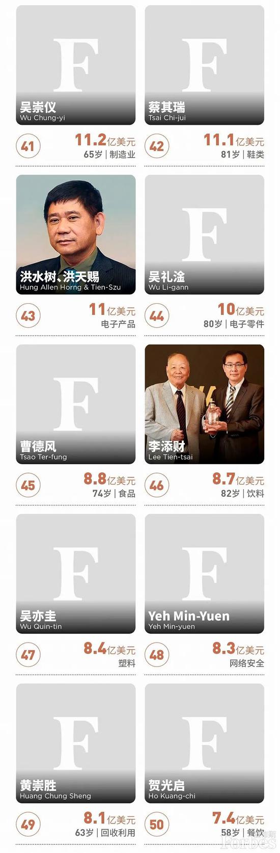 国泰金控的蔡宏图、蔡政达以92亿美元的财富蝉联第二。富邦金控的蔡明忠、蔡明兴身价达到79亿美元,上升两位来到第三名的位置。