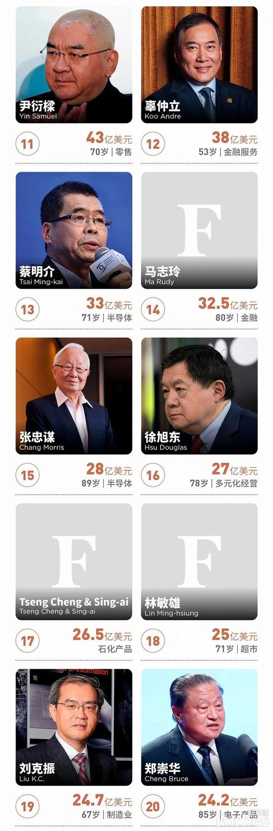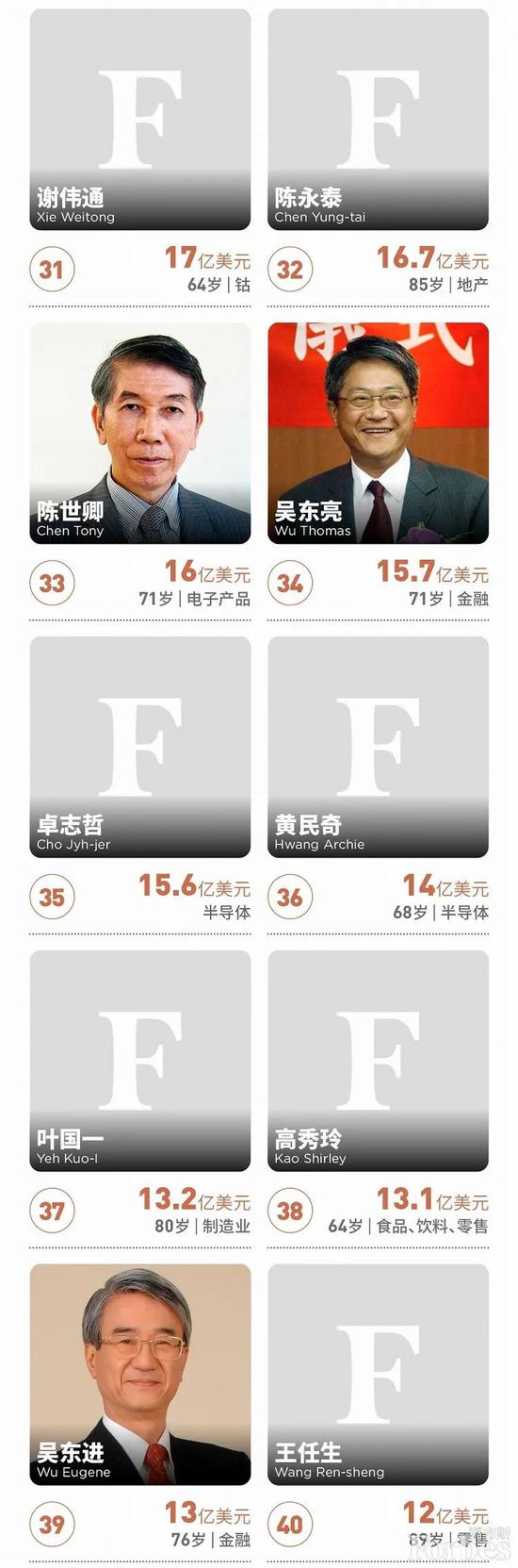 怡球金属资源再生公司的黄崇胜以8.1亿美元的身家再次上榜,排在第49位。去年榜上三名富豪落榜:化妆品公司克丽缇娜的Chen Wu-kang、房地产巨头蔡天赞和林张素娥。