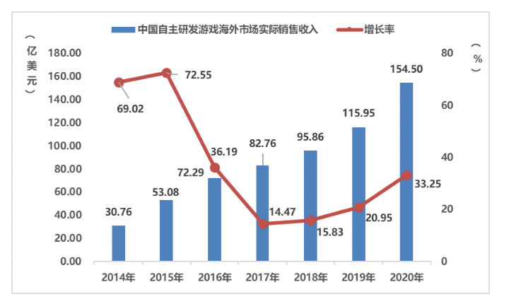 图:中国自主研发游戏海外市场实际销售收入及增长率,《2020年中国游戏产业报告》,中国音数协游戏工委与中国游戏产业研究院