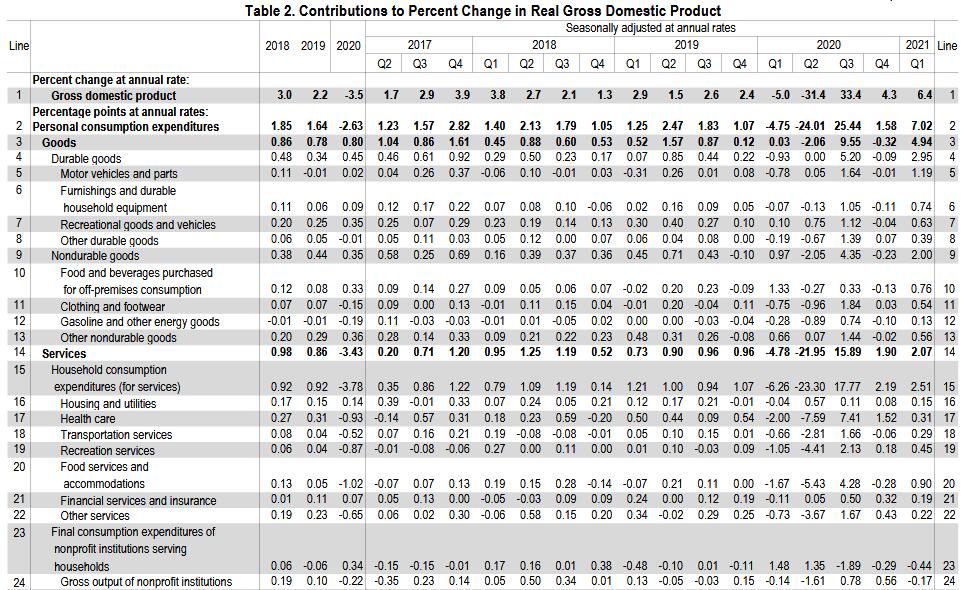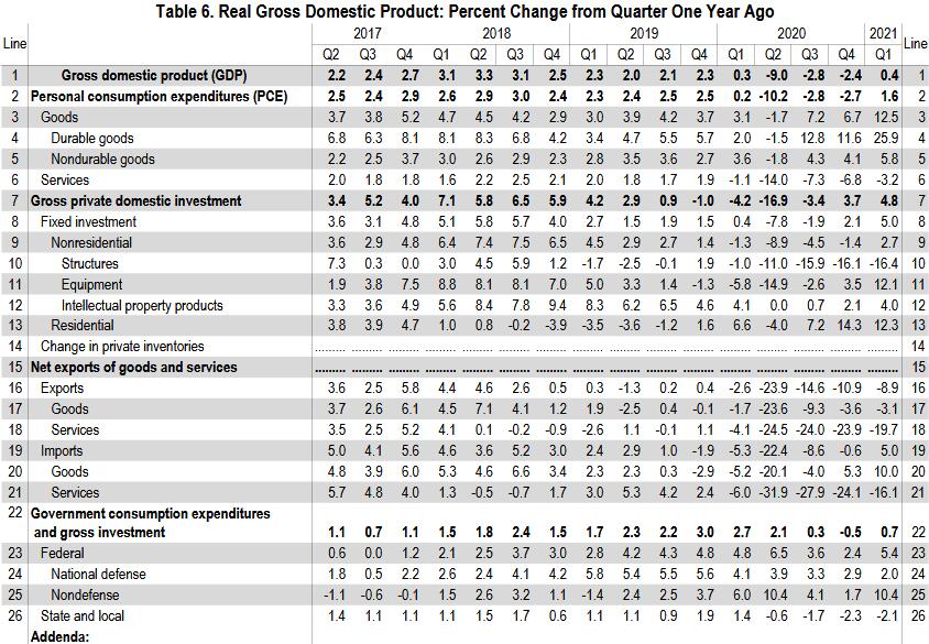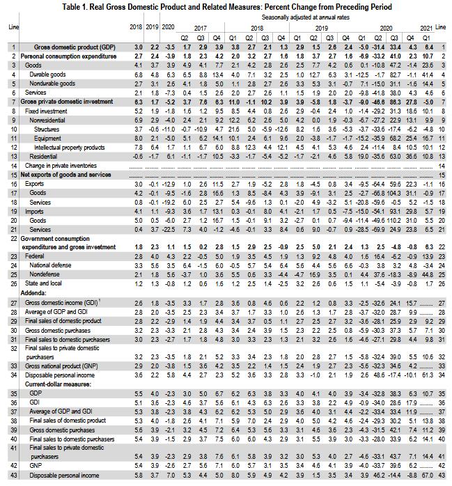 美国经济分析局(Bureau of Economic Analysis)公布的数据显示,2021年第一季度国内生产总值(GDP)以每年6.4%的速度增长。2020年第四季度增长了4.3%。