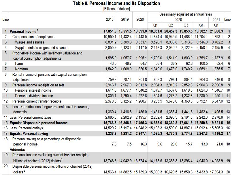 第一季度个人可支配收入增长2.36万亿美元,增长67.0%,而第四季度个人可支配收入减少4021亿美元,即-8.8%。个人实际可支配收入增长61.3%。