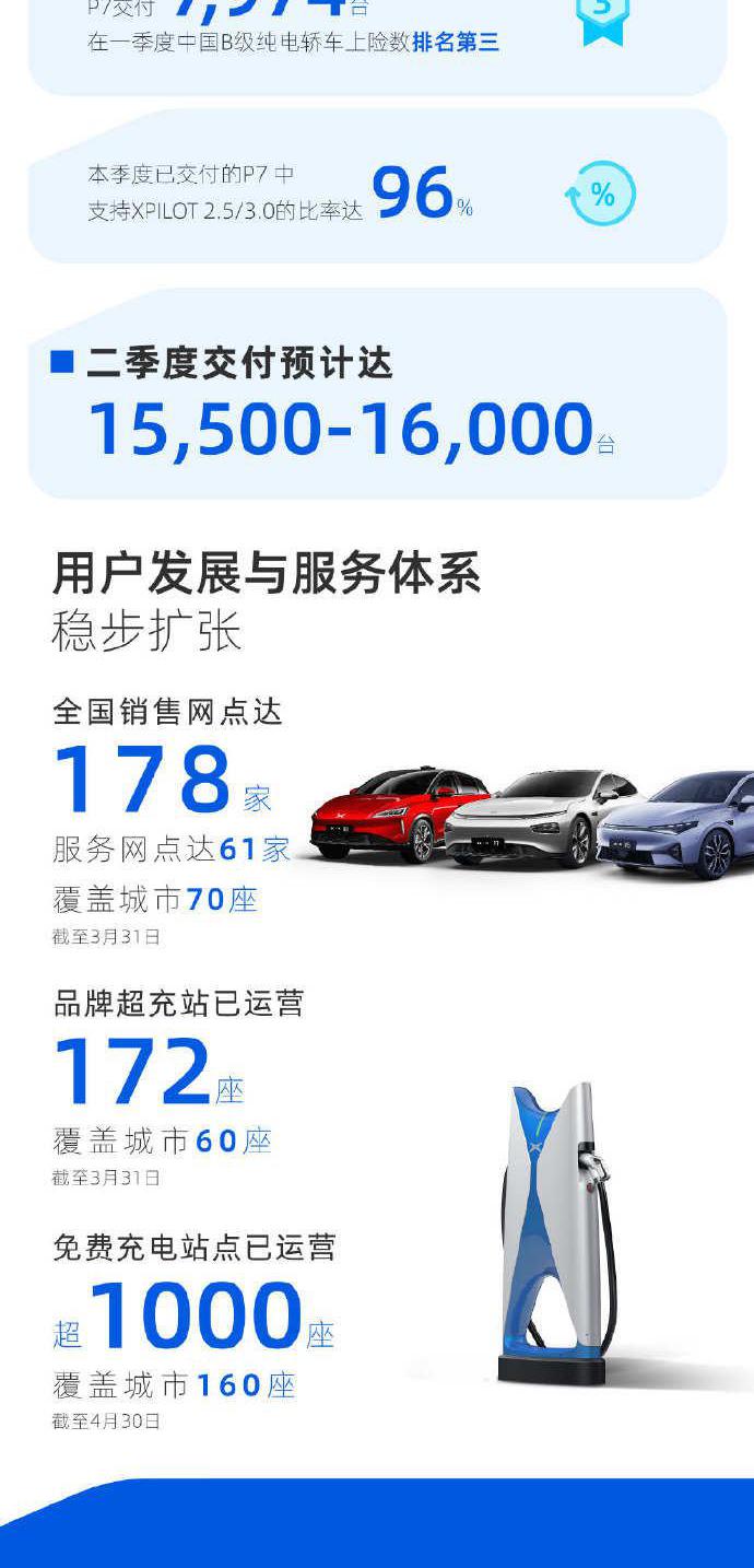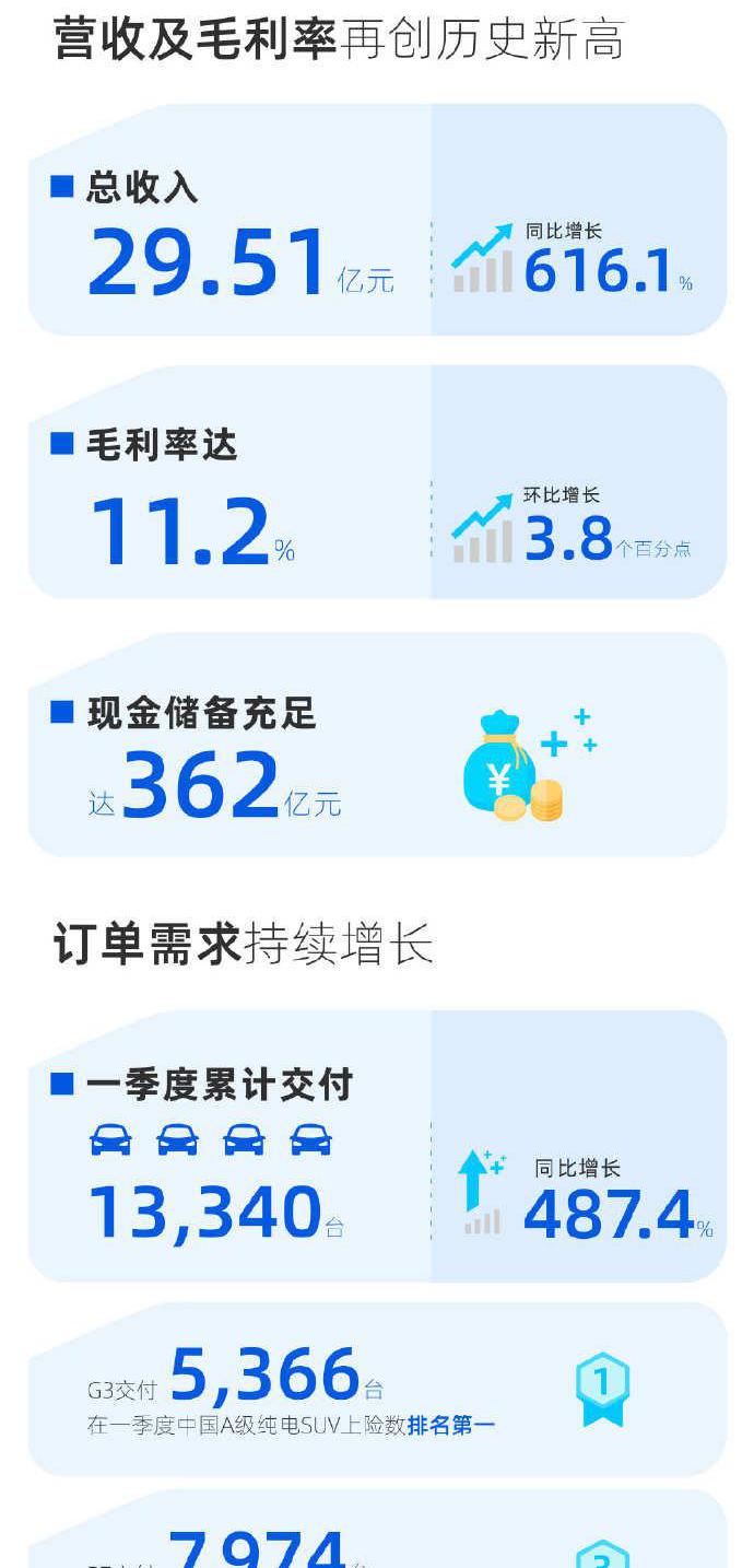 - 一季度共计交付汽车13340辆,同比增长487.4%;其中,G3交付5366台,P7交付7974台;