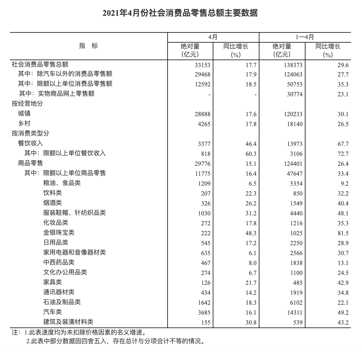 按消费类型分,4月份,商品零售29776亿元,同比增长15.1%,两年平均增长4.8%;餐饮收入3377亿元,增长46.4%,两年平均增长0.4%。1—4月份,商品零售124401亿元,同比增长26.4%,两年平均增长4.8%;餐饮收入13973亿元,增长67.7%,两年平均下降0.7%。