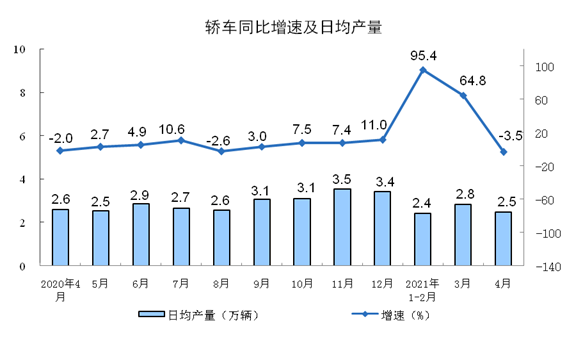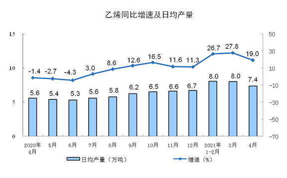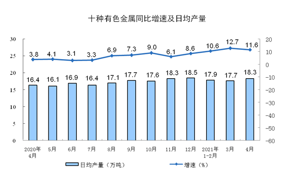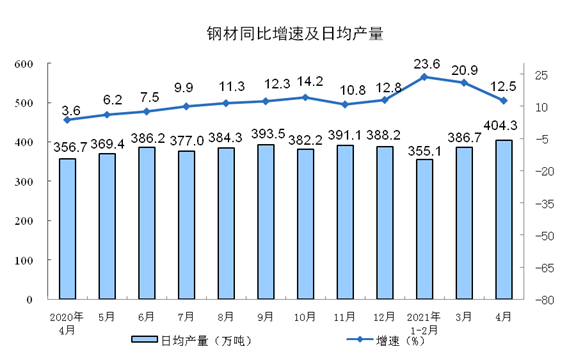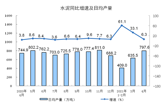 分产品看,4 月份,612 种产品中有 445 种产品同比增长。钢材 12128 万吨,同比增长 12.5%;水泥 23928 万吨,增长 6.3%;十种有色金属 548 万吨,增长 11.6%;乙烯 221 万吨,增长 19.0%;汽车 227.3 万辆,增长 6.8%,其中,新能源汽车 22.9 万辆,增长 175.9%;发电量 6230 亿千瓦时,增长 11.0%;原油加工量 5790 万吨,增长 7.5%。