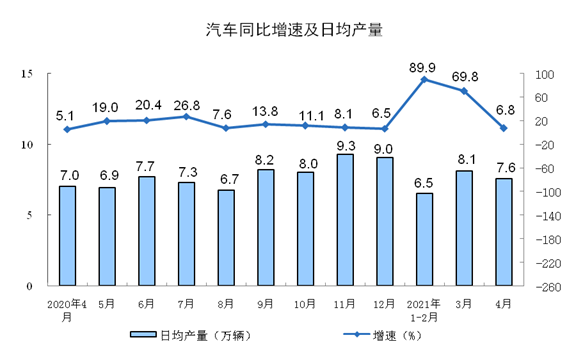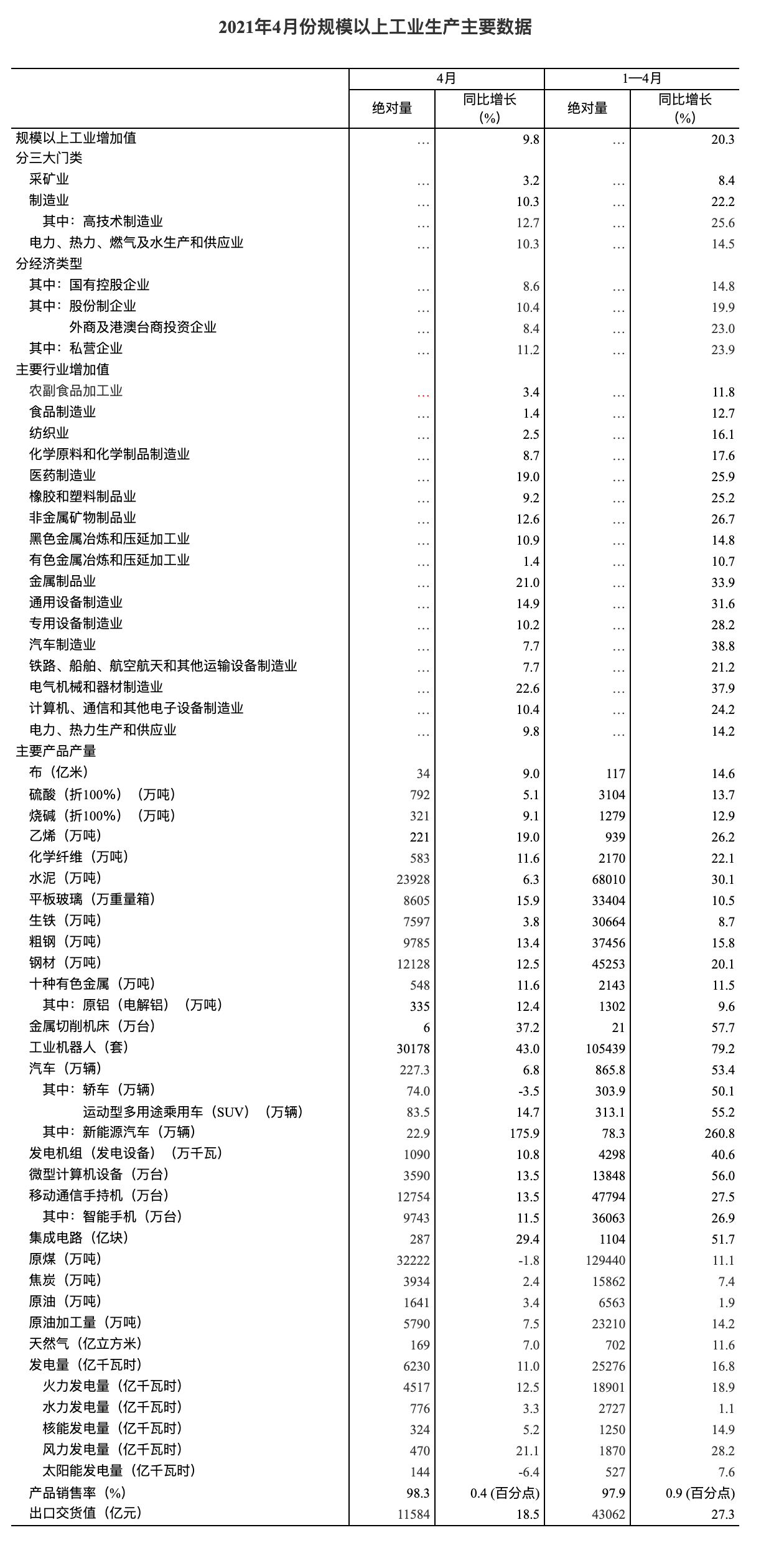 4 月份,规模以上工业增加值同比实际增长 9.8%(以下增加值增速均为扣除价格因素的实际增长率),比 2019 年同期增长 14.1%,两年平均增长 6.8%。从环比看,4 月份,规模以上工业增加值比上月增长 0.52%。1—4 月份,规模以上工业增加值同比增长 20.3%。