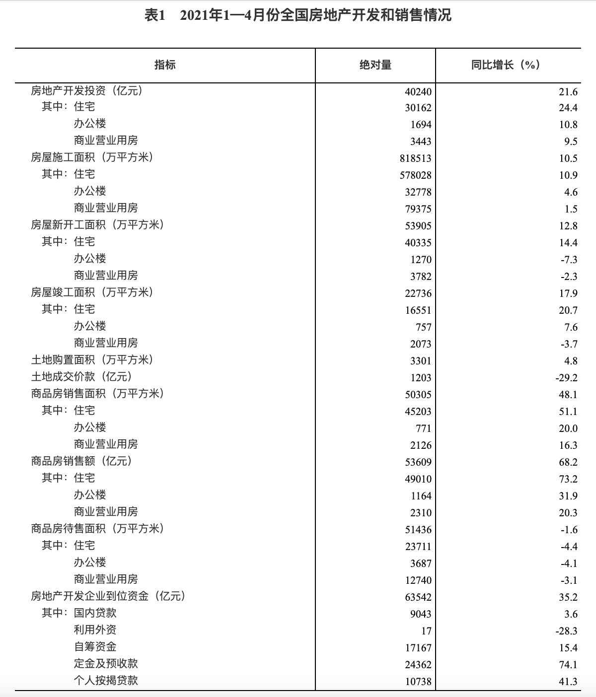 1—4 月份,商品房销售面积 50305 万平方米,同比增长 48.1%;比 2019 年 1—4 月份增长 19.5%,两年平均增长 9.3%。其中,住宅销售面积增长 51.1%,办公楼销售面积增长 20.0%,商业营业用房销售面积增长 16.3%。商品房销售额 53609 亿元,增长 68.2%;比 2019 年 1—4 月份增长 37.0%,两年平均增长 17.0%。其中,住宅销售额增长 73.2%,办公楼销售额增长 31.9%,商业营业用房销售额增长 20.3%。