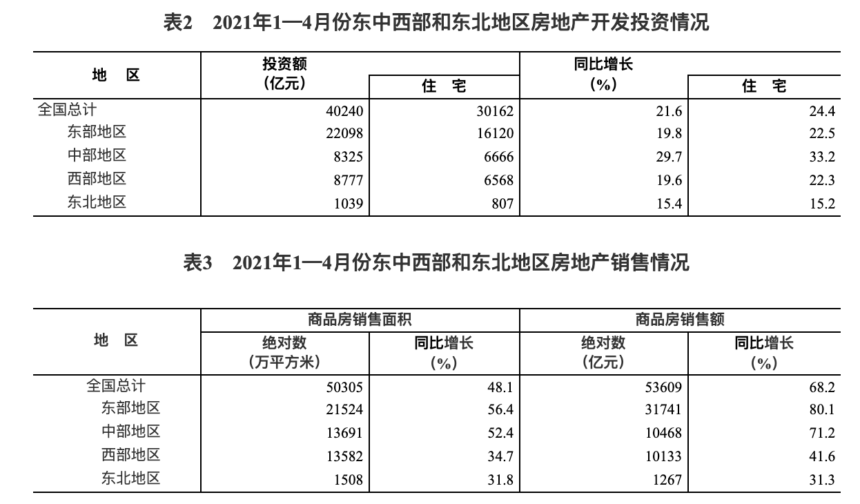 1—4 月份,东部地区商品房销售面积 21524 万平方米,同比增长 56.4%;销售额 31741 亿元,增长 80.1%。中部地区商品房销售面积 13691 万平方米,增长 52.4%;销售额 10468 亿元,增长 71.2%。西部地区商品房销售面积 13582 万平方米,增长 34.7%;销售额 10133 亿元,增长 41.6%。东北地区商品房销售面积 1508 万平方米,增长 31.8%;销售额 1267 亿元,增长 31.3%。