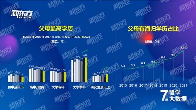 在意向留学家庭家长群体的学历背景上,根据七年来的数据,高学历群体的占比持续上升。