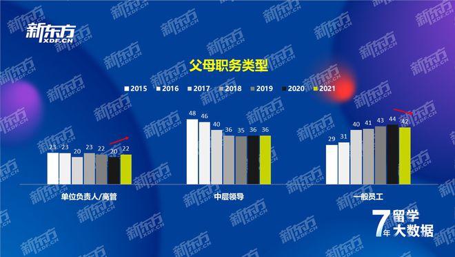根据连续七年调研数据显示,意向留学家庭父母的职务由过去的以“中层领导”发展至以“一般员工”为主。2021年,普通家庭仍是意向留学群体的主体,但受疫情影响,占比有小幅回落,占比42%。与此同时,父母任职“单位负责人/高管”的留学家庭群体较2020年有小幅上升,可见疫情之下精英家庭对于留学的认可度依然很高。