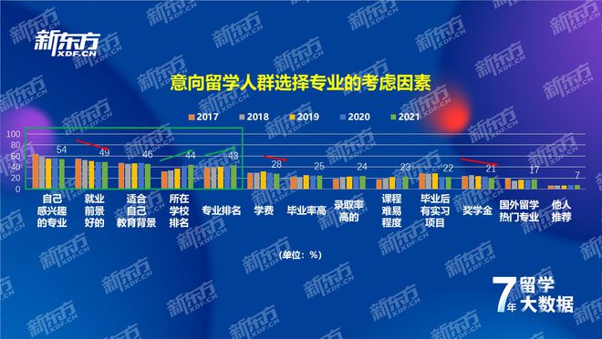 个人兴趣、就业前景、与原教育背景的匹配度,一直是选择留学专业的“黄金指标”。不过近几年的数据显示,留学生及其家庭对于排名的追求和对于费用的敏感度降低同样体现在了专业选择上,即越来越关注专业排名及专业所在学校的排名,而对于学费和奖学金的关注程度则有所下降。