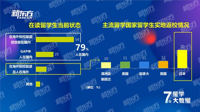受疫情影响及各国入境政策限制,近8成海外院校在读学生目前仍在国内,54%的人群在国内就读网课,25%的人群选择GAP 一段时间在国内进行实习或暂时休整。15%的在读留学生目前人在海外就读。其中,日本因疫情控制情况相对良好,留学生实地返校就读率相较别国最高;而在澳新、美国、加拿大和英国的留学生返校状况则比较接近。