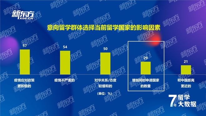 疫情爆发以来,各国对控制疫情的政策与控制情况也不断变化,成为了影响留学目的国选择的主要原因。超过半数的意向留学群体倾向于选择疫情应对政策更积极、疫情情况不严重以及疫情期间对华态度较为缓和的留学国家。此外,近3成的人群倾向于通过增加同时申请的国家数量,来保障留学规划的稳妥,应对疫情为留学规划带来的不确定性。