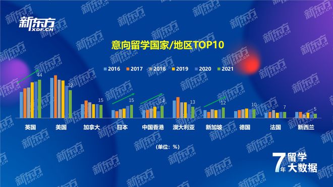 在留学目的国中,英国、美国和加拿大依然受到很多准留学生的青睐,选择赴英留学的学生逐年攀升,在今年的意向留学国家上,英国延续了过去几年来的上升趋势,依然是目前中国学生心目中最向往的留学国家。美国虽然近几年呈下降趋势,但目前仍是第二位。并且亚洲各留学国家及地区的影响力也在不断增强。
