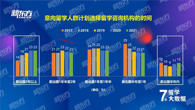 随着留学人群的逐年增多,竞争加大,提前计划选择留学机构的意向留学人群仍占多数,距出国2年以上便开始选择留学机构的群体占比逐年上升,达23%。但同时,近三年来,在距出国半年内快速选择留学咨询机构的比例也在上升。可见随着留学人群的增多,缺少申请经验的群体和临时决定留学计划的群体也在增多,导致短时间筹备后即出国的情况占比上升。