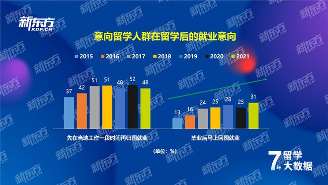 随着国内经济的发展和疫情控制得当,相较2020年,2021年意向留学生对国内的就业环境更加有信心,选择毕业后马上回国就业的留学生人数增多,占比31%,较上一年增长6%。这与国内经济快速发展,企事业单位对国际化人才需求增多有关。并且企业在管理上也在与国际接轨,留学生回国就业适应期更短。