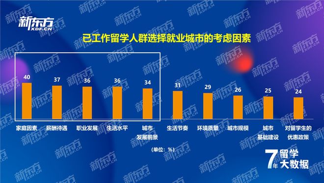 数据显示,留学生在选择就业城市时将家庭因素放在优先考虑范围。占比40%。这与中国传统文化影响有关,一部分是因为故土难离,还有一部分是因为家庭所维系的人脉关系可以提供很多助力。