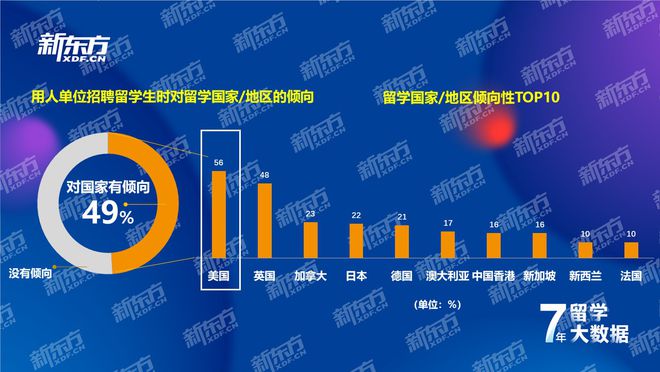 根据调研数据,当前49%的用人单位在招聘时对留学生的留学国家有喜好倾向,用人单位依然更倾向雇佣来自美国、英国、德国和日本等留学大国的留学生。但数据也显示,中国香港、新加坡等亚洲国家的留学质量也逐渐受到用人单位的认可,这归功于国际教育的普及。