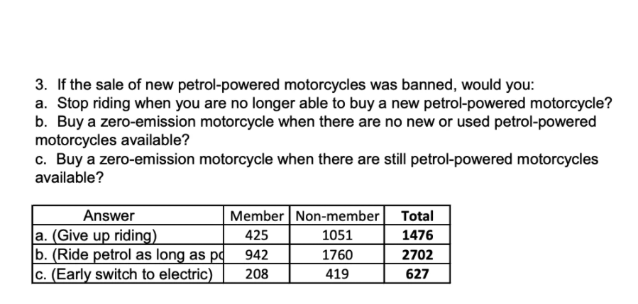 但是,当被问及如果实施这样的禁令他们会怎么做时,令人惊讶的是,有31%的骑手说,当新的汽油动力摩托车无法使用时,他们会完全放弃骑行,而不是在改用电动车之前尽可能地继续骑汽油动力摩托车(56.2%),或者在汽油动力车型仍可使用时提前购买一辆零排放摩托车(13%)。