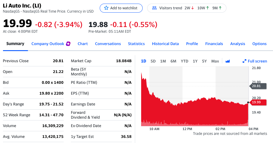 图2:理想汽车股价盘前下跌0.55%