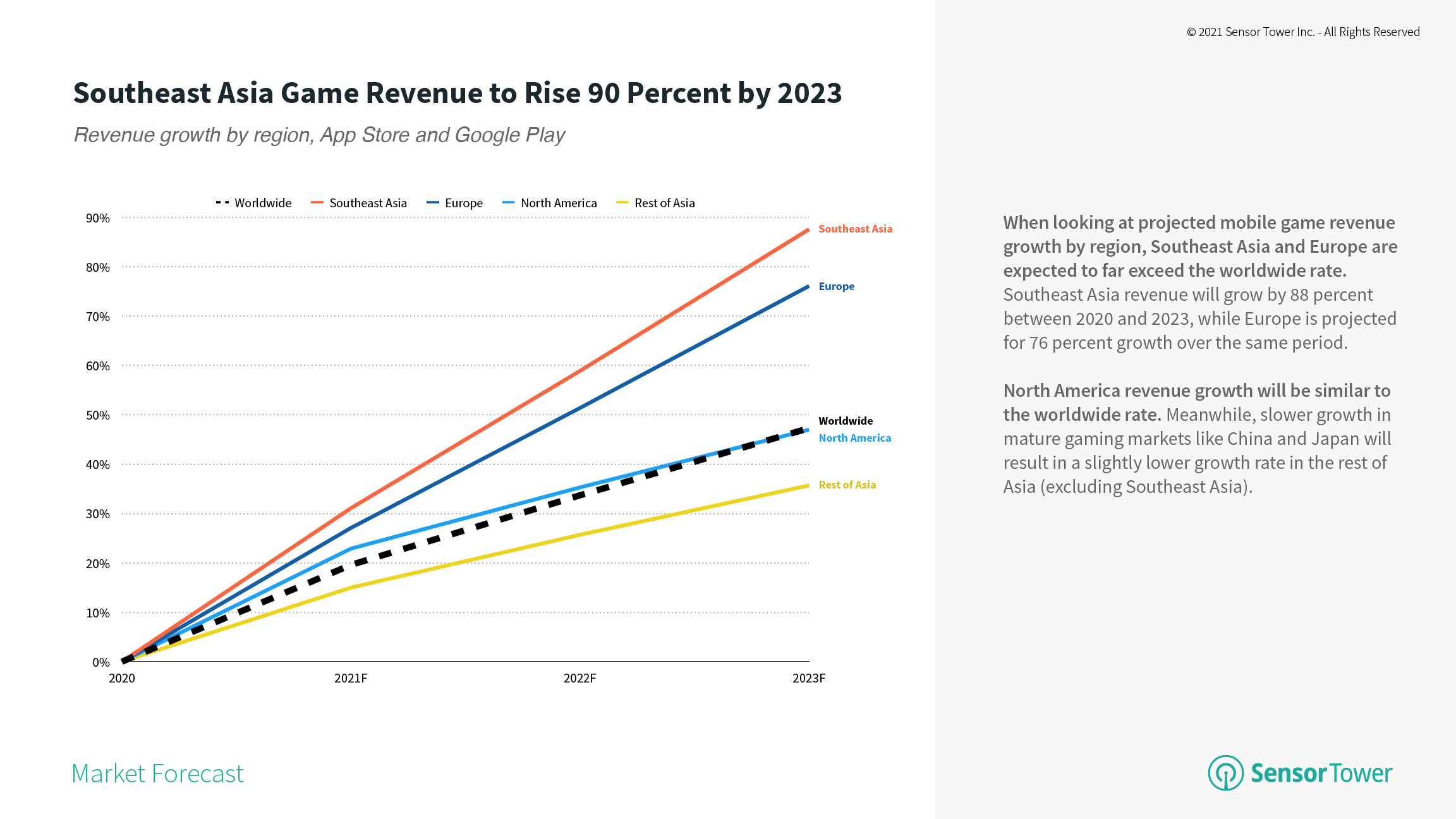 该统计还预测,到2023年,东南亚地区的手游市场收入将增长88%,将会是全球增长最快的市场;全球手游市场在苹果和谷歌商店的玩家消费量总额将高达1170亿美元。