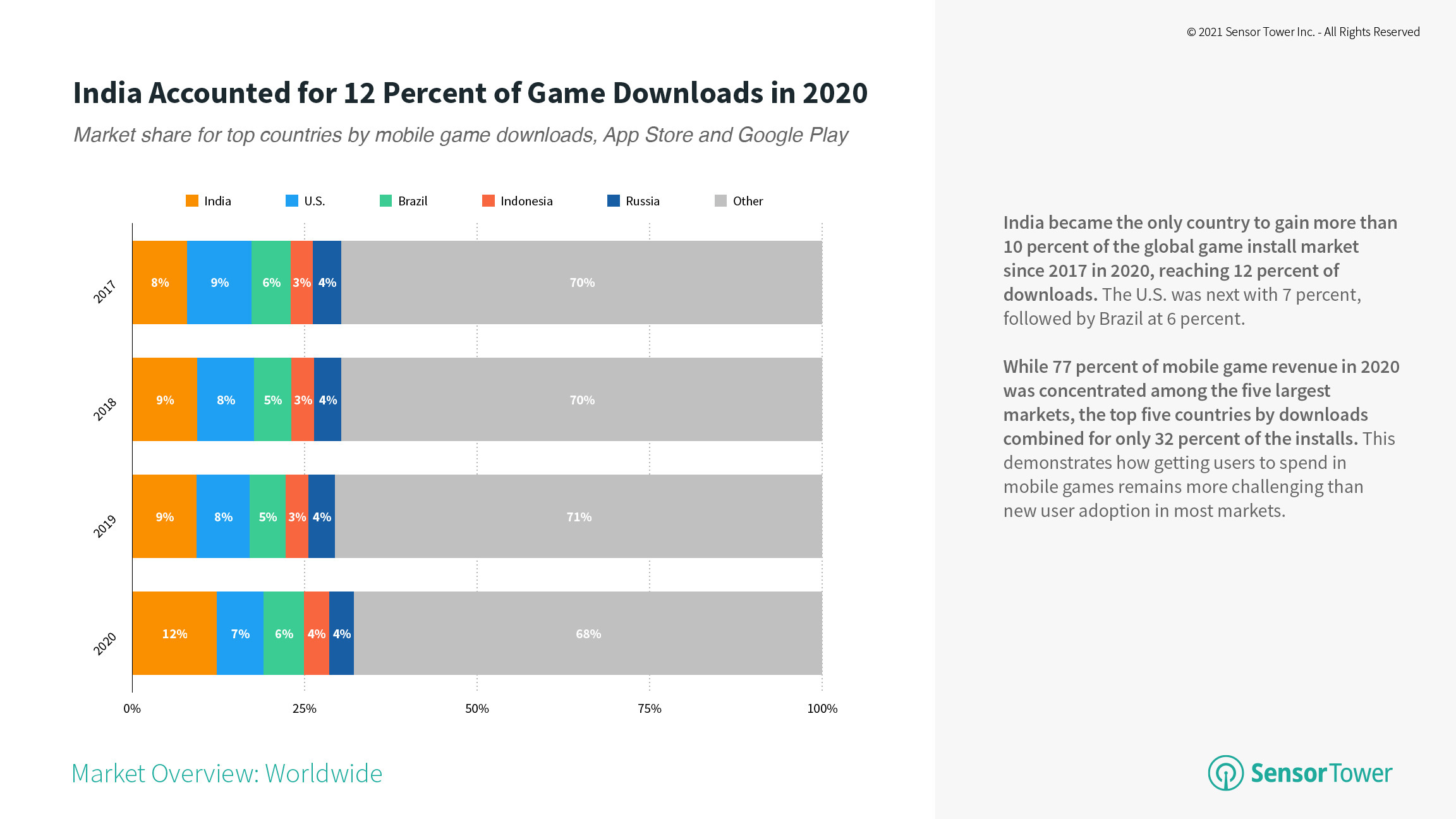 而就下载量来说,印度在市场占比中领先,下载量高达97亿,占总份额的12%。该公司还特意提到,印度是唯一一个自2017年起手游下载量占比超过10%的国家,第二名美国和第三名巴西在2020年统计中分别占比7%和6%。