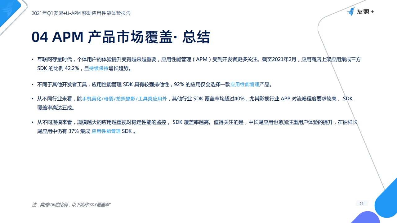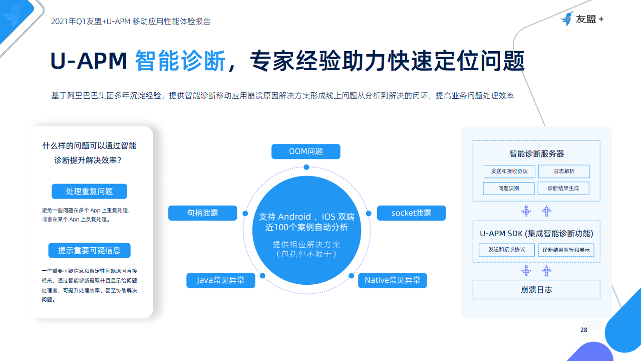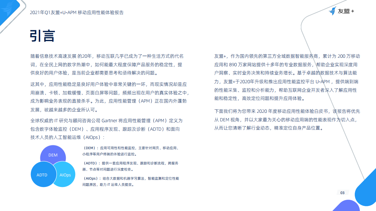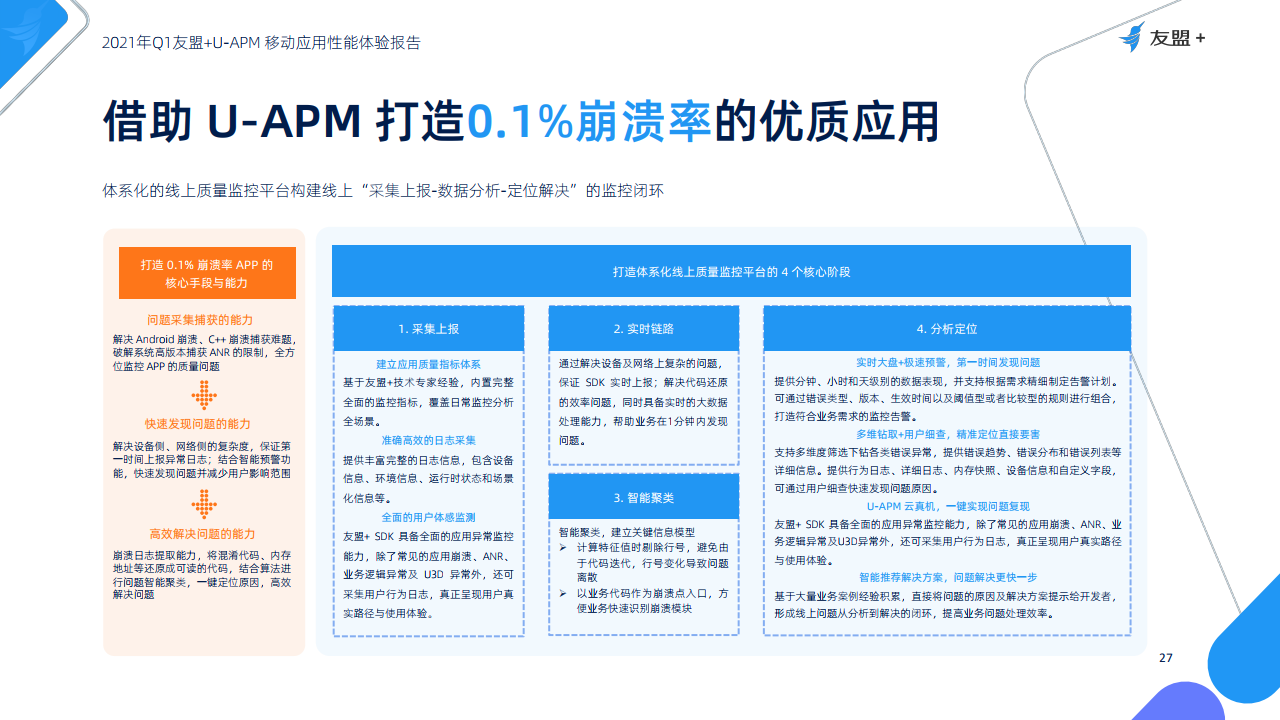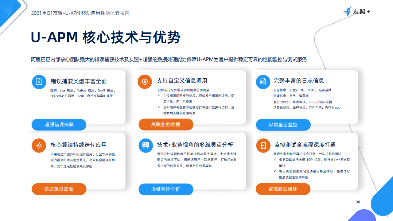 2020年,友盟+原移动分析U-App错误分析模块正式升级为U-APM应用性能监控平台。提供端到端的性能采集、监控和分析能力,帮助互联网企业开发者深入了解应用性能和稳定性,高效定位问题和提升应用体验。经过近一年的观察,带来这份友盟+《2020 年度移动应用性能体验白皮书》,该报告将优先从DEM 视角,并以大家最为关心的移动应用端的性能表现作为切入点,从而让您清晰了解行业动态,精准定位自身产品位置。