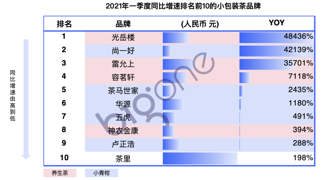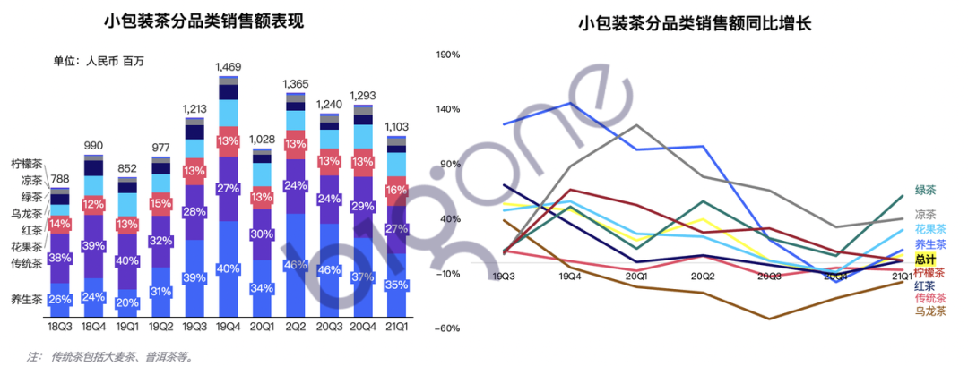 从细分品类表现来看,小包装茶中养生茶和传统茶占比约 60%,但从增速上看养生茶和传统茶增速在明显放缓;虽然整体小包装茶增速在放缓,但是绿茶和花果茶在 2021 年一季度的增速明显回升。