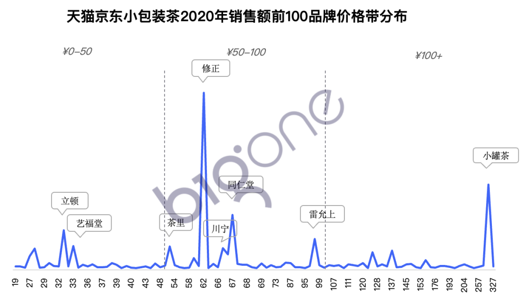 从价格带来看,小包装茶的件均价基本集中在 50-100 元之间,在这一价格带区间修正小包装茶处于头部位置,其次是同仁堂,新消费品牌茶里、川宁的小包装茶也崭露头角;小罐茶主打高价格带路线,在高价格带上处于头部位置。