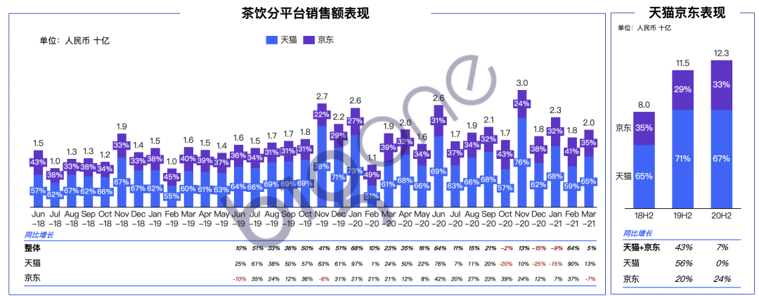 从线上销售渠道看,2020 年天猫和京东茶饮实现约 242 亿元销售额,同比 2019 年增长约 20%,其中天猫占比约 70%;但 2020 下半年茶饮同比增速明显放缓。
