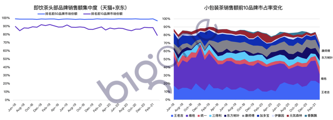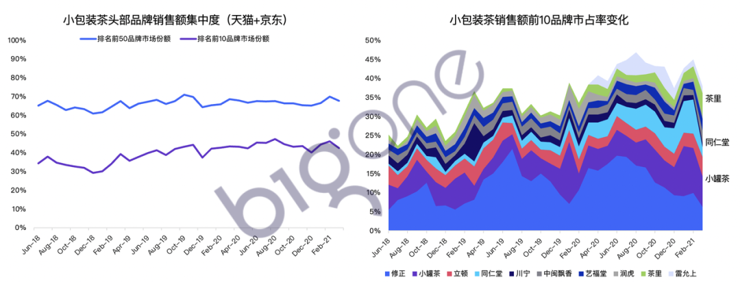 从品牌集中度来看,小包装茶的头部品牌销售额集中度呈现上升趋势,尤其是销售额排名前 10 的品牌,主要因为新消费品牌小罐茶、茶里的市占率不断提升,传统品牌同仁堂的小包装茶市占率也不断上升。