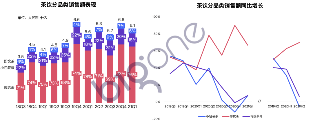 而分包装形式看,在茶饮中,即饮茶虽然规模较小,但自 2019 年下半年以来一直保持高速增长,远超茶饮整体大盘增速;自 2019 年下半年以来一直保持加速增长;而传统茶叶和小包装茶的增速在持续下滑。