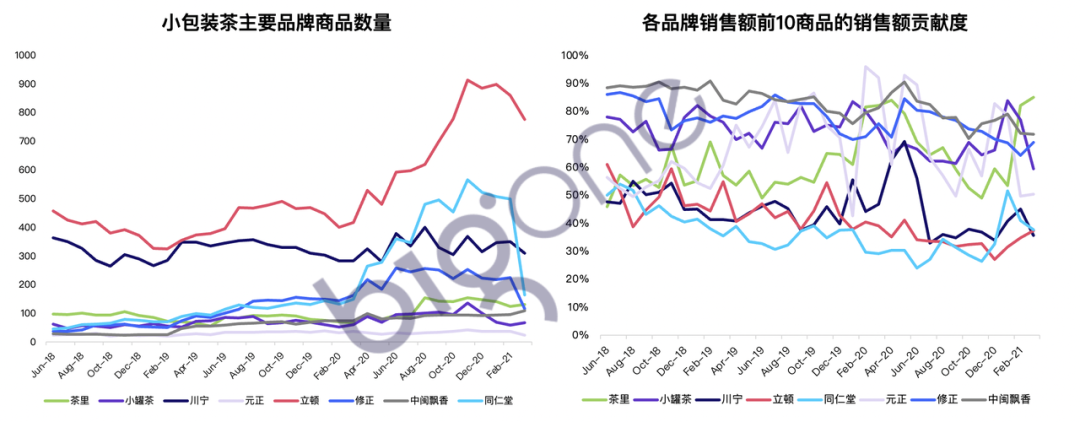 虽然小包装茶整体增速在放缓甚至在 2020 年下半年出现同比下滑,但是新小包装茶品牌小罐茶、茶里和传统品牌同仁堂仍保持较高的增速。而他们成功出圈的原因各有不同,立顿和同仁堂头部商品销售额贡献度较低,说明其更偏向多商品的产品策略;而新小包装茶品牌小罐茶、茶里头部商品销售额贡献度较高,说明更偏向打造爆款的策略。