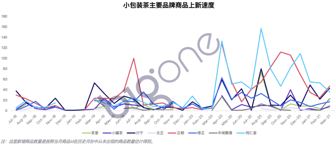 在上新频率上,新式小包装茶品牌小罐茶、茶里、元正等出新频率较低,更注重出新品的质量;而但同仁堂、立顿等传统袋泡茶品牌出新频率较高。