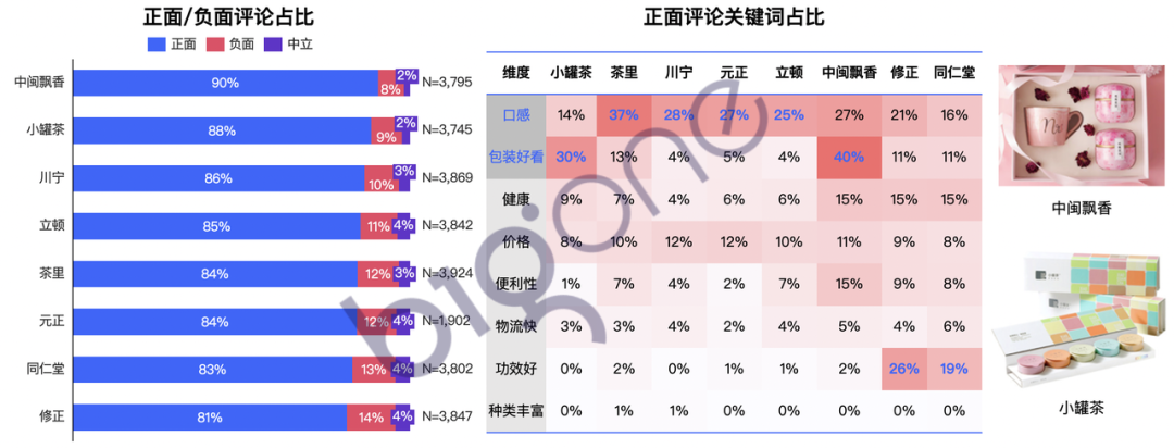 而在电商评论中,中闽飘香和小罐茶好评率最高,主要得益于精美包装;茶里、川宁、立顿处于中等位置,好评主要得益于其口感好;修正和同仁堂主要销售养生茶,其好评主要来自对其功效的正面评价。