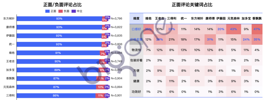 在电商评论中,东方树叶和康师傅好评率最高,主要得益于价格实惠;维他和王老吉处于中等位置,维他的好评主要得益于其口感,王老吉的好评主要得益于价格实惠;而香飘飘 MECO 的好评中主要来自口感和价格实惠。