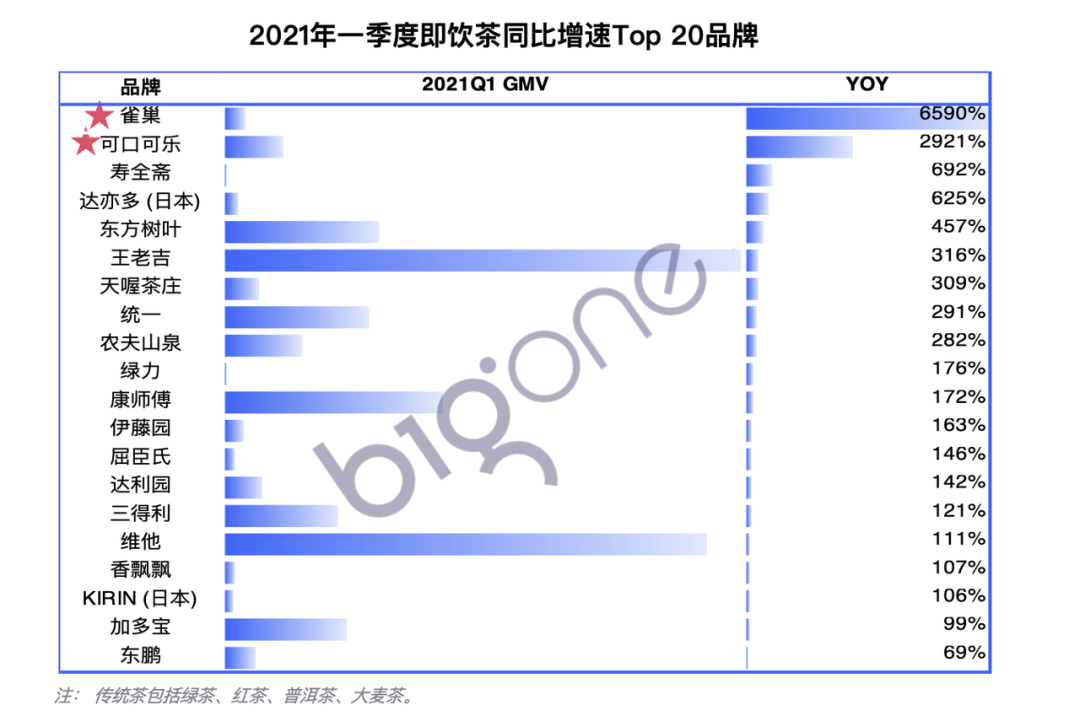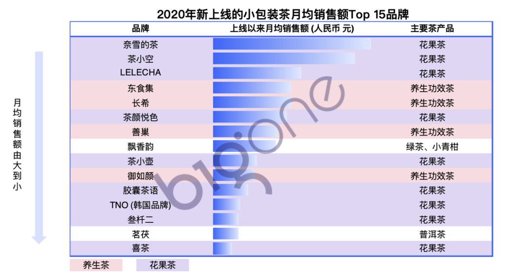 202Q1 增长较快的品牌主要是养生功效茶和小青柑,茶里的花果茶也表现较好;2020 年新上线电商平台的小包装茶品牌有 2,000 多个,其中上市以来月均销售额排名靠前的主要是花果茶品牌;值得注意的是,线下开店模式的奶茶品牌巨头奈雪的茶、乐乐茶、喜茶、茶颜悦色等都开始在线上布局小包装的花果茶。