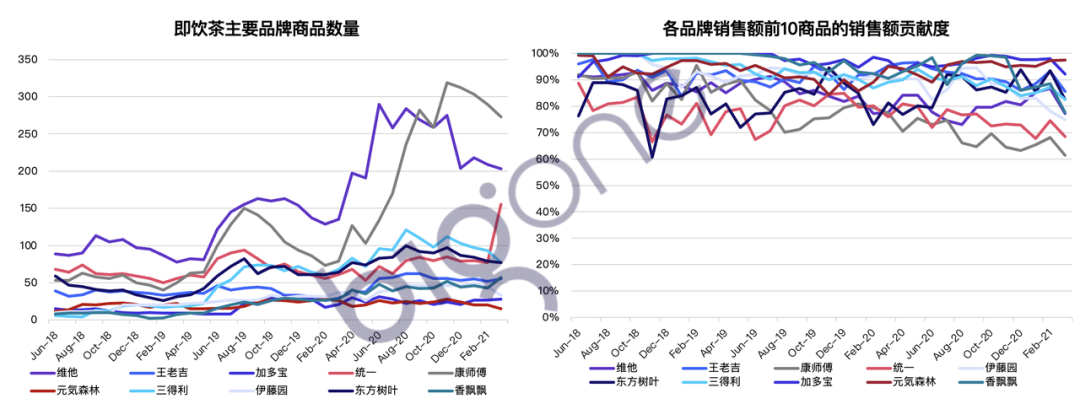 即饮茶整体在加速增长,主要受到来自王老吉、东方树叶、香飘飘 MECO 加速增长的影响;元气森林即饮茶在 2019 年下半年和 2020 年上半年增速较快,但是 2020 年下半年增速有所放缓;头部即饮茶品牌几乎都在丰富商品,维他和康师傅商品数量增速最快;香飘飘 MECO、加多宝和元气森林更偏向打造爆款的策略,维他的商品策略在向商品丰富度上偏移;王老吉和东方树叶越来越集中在头部商品发力。