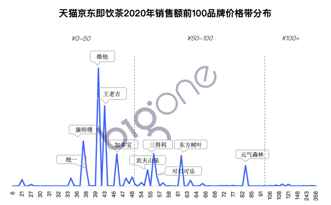 从价格带来看,即饮茶的件均价基本集中在 0-50 元和 50-100 元之间,主要是 0-50 元;在 0-50 元区间,维他和王老吉处于绝对头部位置,其次是康师傅和加多宝;在 50-100 元区间,品牌竞争较为激烈。