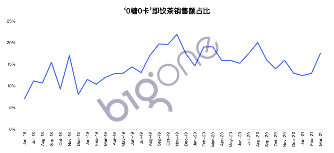 主打 “0 糖 0 卡” 的即饮茶自 2018 年下半年以来占比呈现上升趋势,目前占整体即饮茶比重约 20%-25%,但是自 2019 年年底开始有下滑趋势。