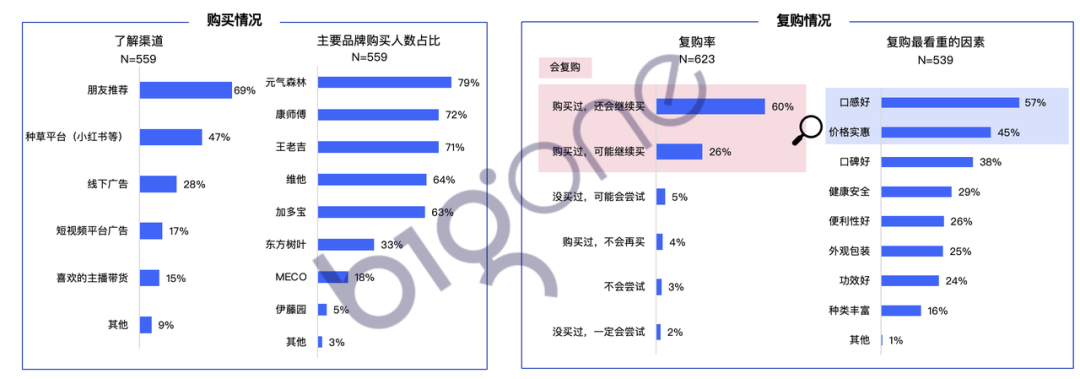 从调研结果看,整体即饮茶中新茶饮品牌元气森林购买人数占比最高,其次是传统品牌康师傅、王老吉、维他和加多宝,主要受到朋友推荐而去购买,其次是受到种草平台影响;在整体样本中,即饮茶的复购比例约 86%,最看中的因素是口感好和价格实惠。