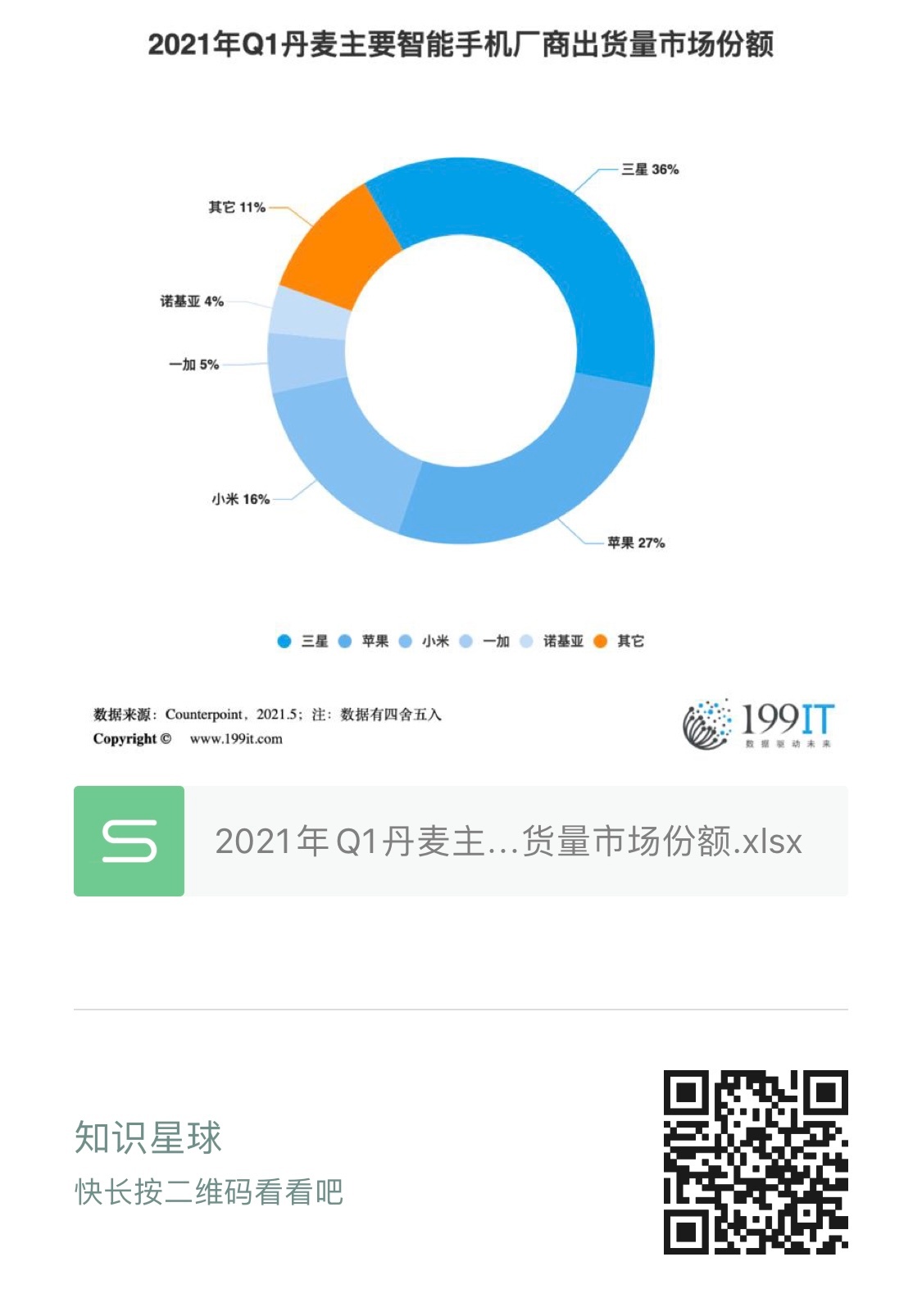 2021年Q1丹麦主要智能手机厂商出货量市场份额(附原数据表) ​​​​
