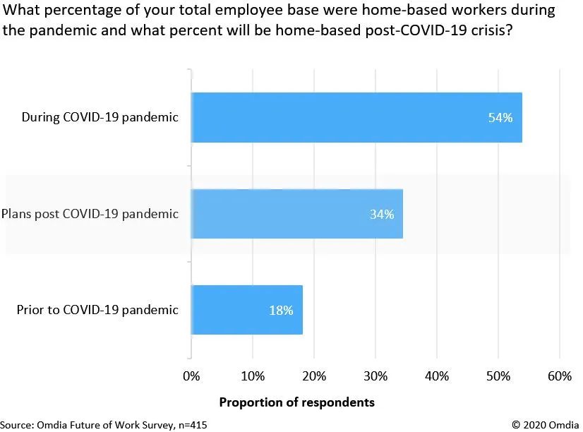 - 三分之二的企业计划在后疫情时代为更多的远程办公活动提供支持。由于人们有可能长期采用灵活的办公方式,企业更加重视为移动和远程办公提供支持和保障。