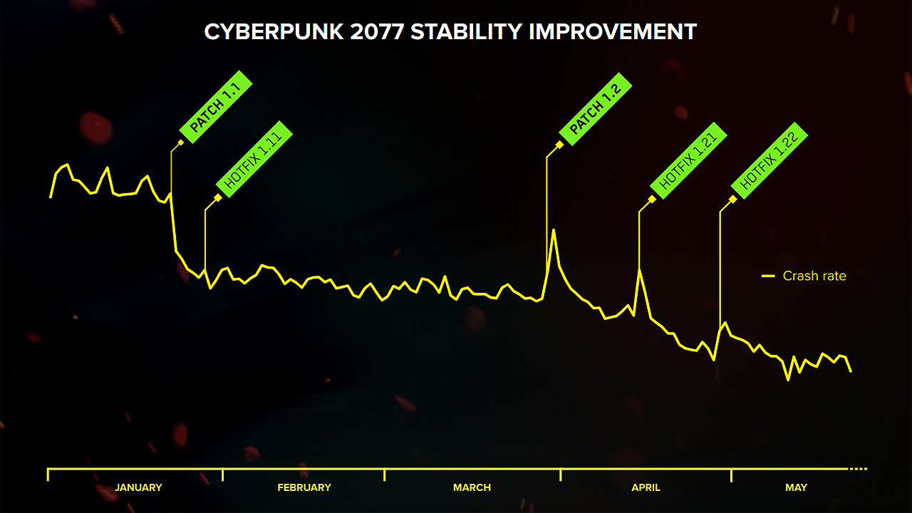从官方分享的一张概览图片来看,可知随着各个修补程序的发布,《赛博朋克 2077》的总体崩溃状况已总体转向良好,但显然距离正式重返 PS 商店仍有很长一段路要走。