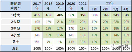 新能源乘用车近几年主要在限购特大城市需求较强,2021年4月新能源乘用车在特大城市,占到总销量34%,较2020年下降4个百分点,这也是说明限购城市的新能源车市场规模逐步稳定。近期的县乡市场新能源逐步启动。